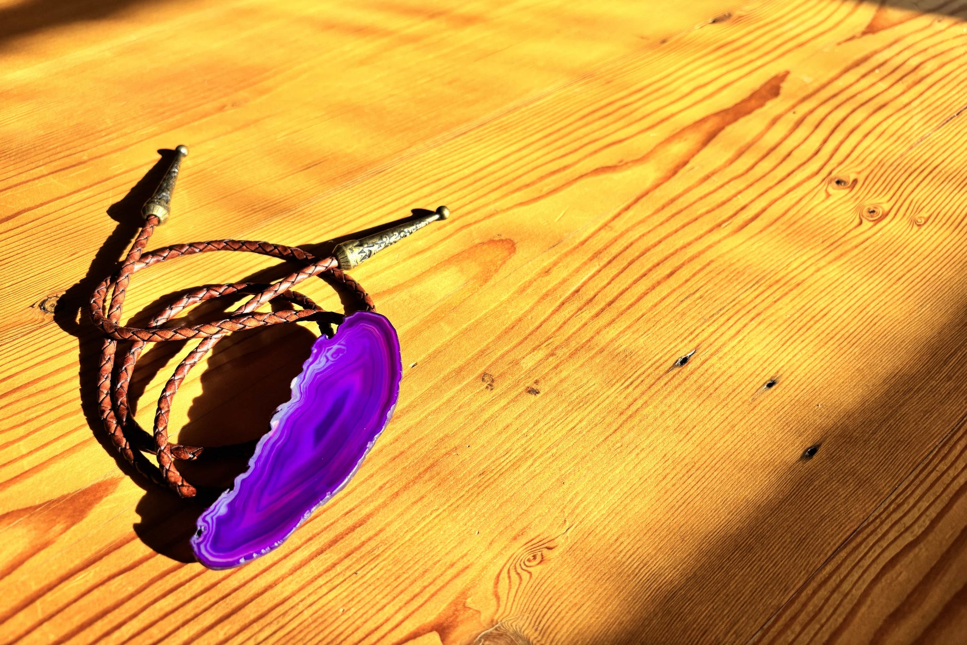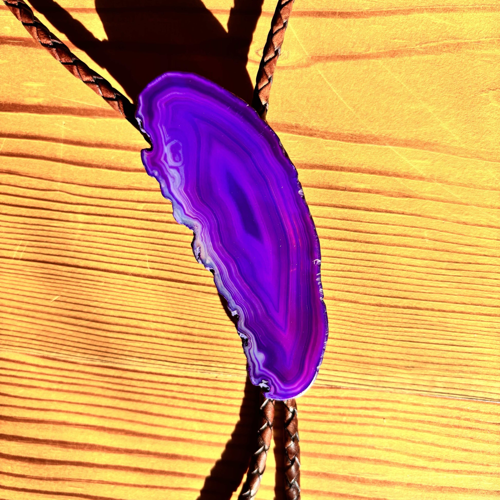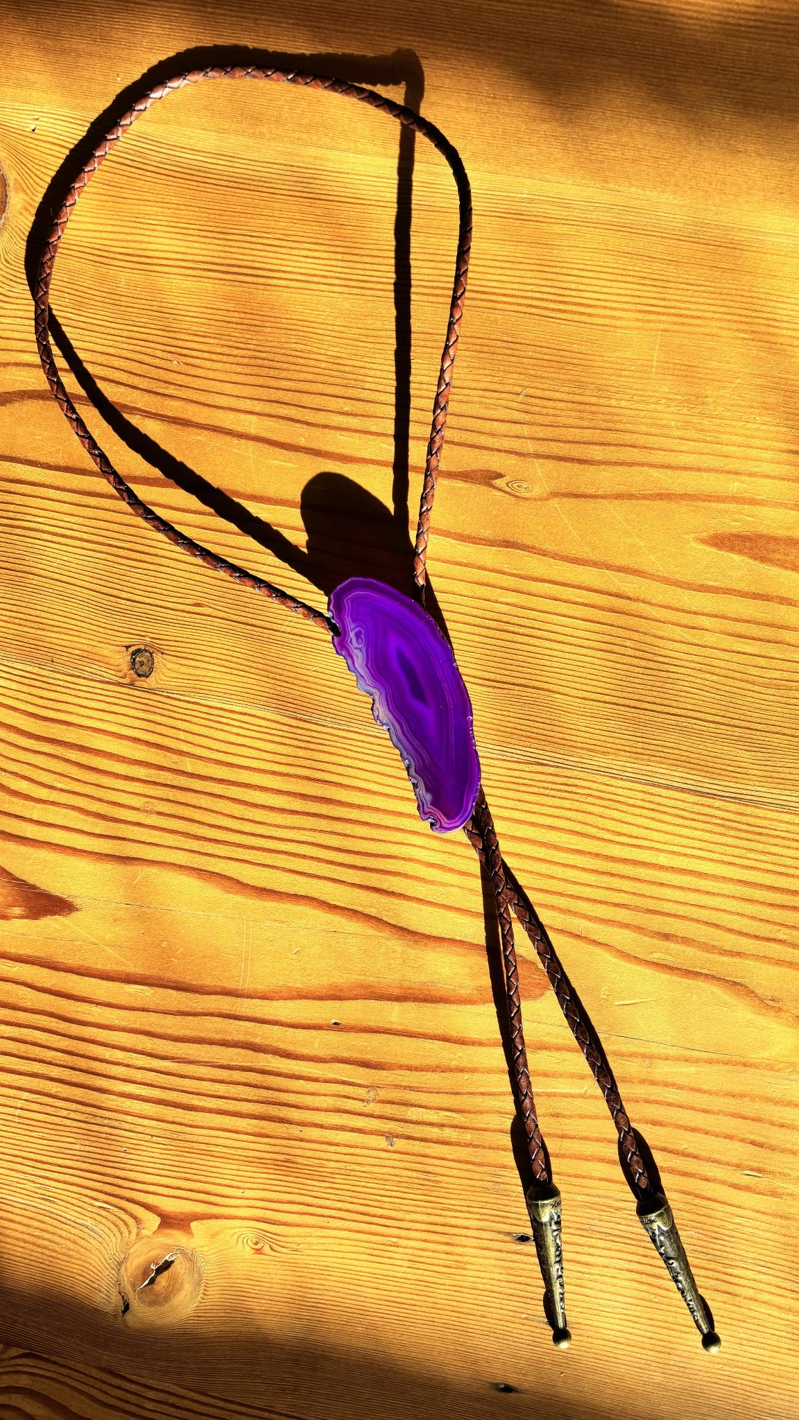 This handmade bolo features a rich purple banded agate slice with braided mahogany leather cord and golden decorative tips. Each bolo features a one-of-a-kind unique agate that is approximately 2-3 inches in size. We can't guarantee an exact color, shape or size since it's a natural product, and each agate is unique (like you). We can only guarantee it will look awesome on you.